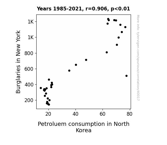 This means 82.1% of the change in the one variable (i.e., Petroluem consumption in North Korea) is predictable based on the change in the other (i.e., Burglaries in New York) over the 37 years from 1985 through 2021.