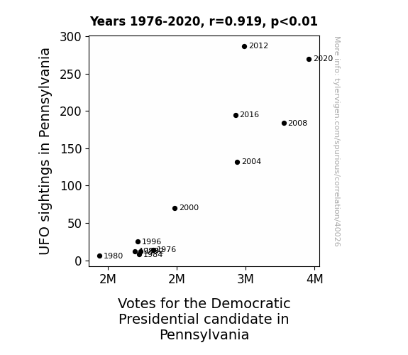 This means 84.5% of the change in the one variable (i.e., Votes for the Democratic Presidential candidate in Pennsylvania) is predictable based on the change in the other (i.e., UFO sightings in Pennsylvania) over the 12 years from 1976 through 2020.