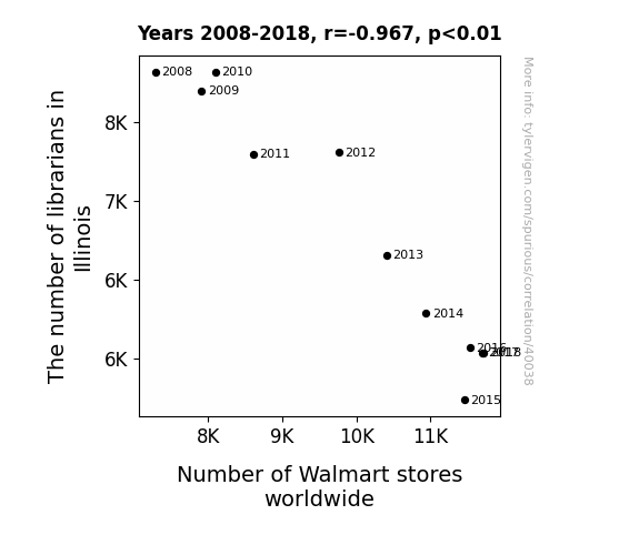 This means 93.6% of the change in the one variable (i.e., Number of Walmart stores worldwide) is predictable based on the change in the other (i.e., The number of librarians in Illinois) over the 11 years from 2008 through 2018.