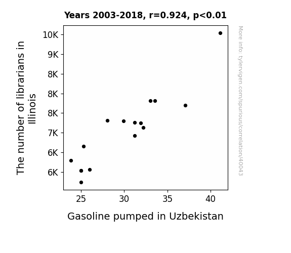 This means 85.3% of the change in the one variable (i.e., Gasoline pumped in Uzbekistan) is predictable based on the change in the other (i.e., The number of librarians in Illinois) over the 16 years from 2003 through 2018.