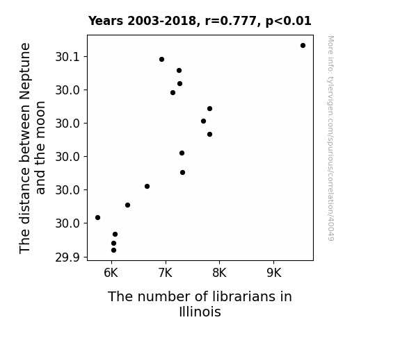 This means 60.3% of the change in the one variable (i.e., The number of librarians in Illinois) is predictable based on the change in the other (i.e., The distance between Neptune and the moon) over the 16 years from 2003 through 2018.