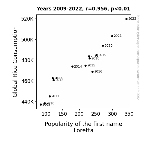 This means 91.4% of the change in the one variable (i.e., Popularity of the first name Loretta) is predictable based on the change in the other (i.e., Global Rice Consumption) over the 14 years from 2009 through 2022.