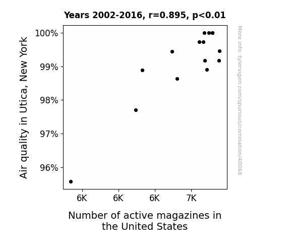 This means 80% of the change in the one variable (i.e., Number of active magazines in the United States) is predictable based on the change in the other (i.e., Air quality in Utica, New York) over the 15 years from 2002 through 2016.