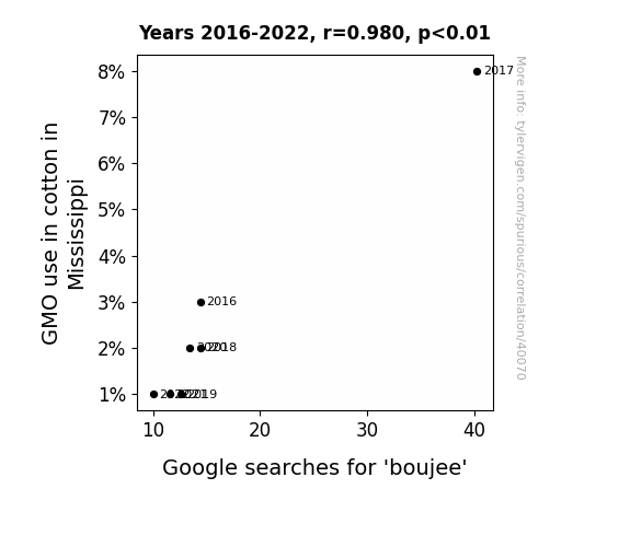 This means 96% of the change in the one variable (i.e., Google searches for 'boujee') is predictable based on the change in the other (i.e., GMO use in cotton in Mississippi) over the 7 years from 2016 through 2022.