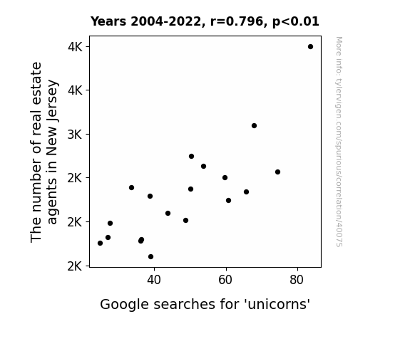 This means 63.4% of the change in the one variable (i.e., Google searches for 'unicorns') is predictable based on the change in the other (i.e., The number of real estate agents in New Jersey) over the 19 years from 2004 through 2022.