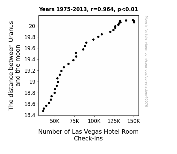 This means 92.9% of the change in the one variable (i.e., Number of Las Vegas Hotel Room Check-Ins) is predictable based on the change in the other (i.e., The distance between Uranus and the moon) over the 39 years from 1975 through 2013.