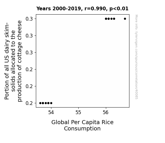 This means 98% of the change in the one variable (i.e., Global Per Capita Rice Consumption) is predictable based on the change in the other (i.e., Portion of all US dairy skim-solids allocated to the production of cottage cheese) over the 20 years from 2000 through 2019.