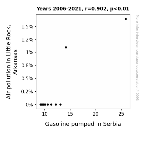 This means 81.4% of the change in the one variable (i.e., Gasoline pumped in Serbia) is predictable based on the change in the other (i.e., Air pollution in Little Rock, Arkansas) over the 16 years from 2006 through 2021.