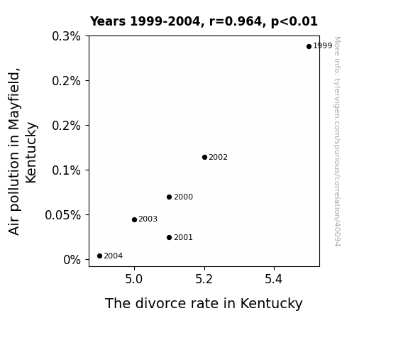 This means 92.9% of the change in the one variable (i.e., The divorce rate in Kentucky) is predictable based on the change in the other (i.e., Air pollution in Mayfield, Kentucky) over the 6 years from 1999 through 2004.