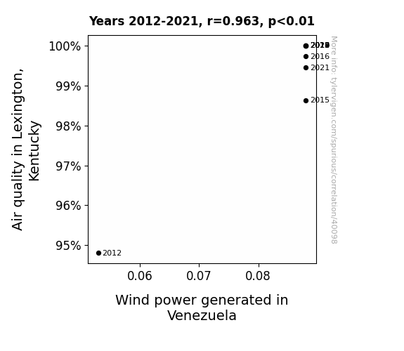 This means 92.7% of the change in the one variable (i.e., Wind power generated in Venezuela) is predictable based on the change in the other (i.e., Air quality in Lexington, Kentucky) over the 10 years from 2012 through 2021.