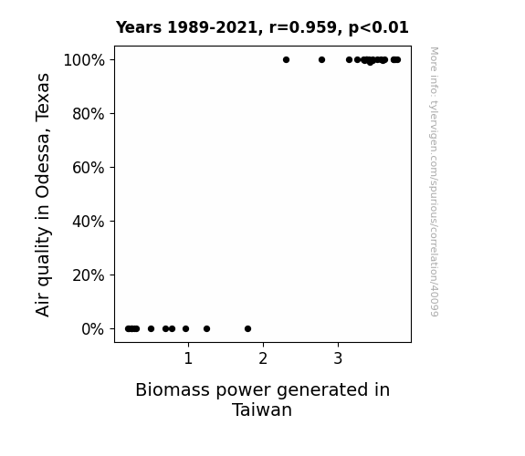 This means 92% of the change in the one variable (i.e., Biomass power generated in Taiwan) is predictable based on the change in the other (i.e., Air quality in Odessa, Texas) over the 33 years from 1989 through 2021.