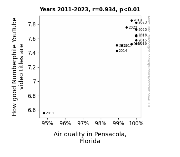 This means 87.3% of the change in the one variable (i.e., Air quality in Pensacola, Florida) is predictable based on the change in the other (i.e., How good Numberphile YouTube video titles are) over the 13 years from 2011 through 2023.