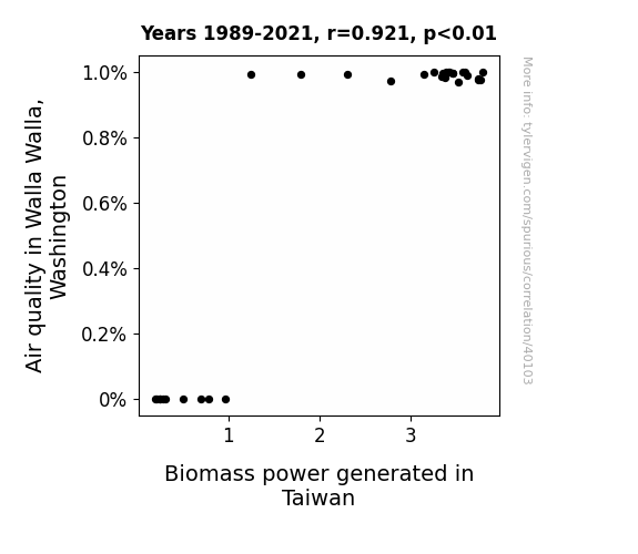This means 84.9% of the change in the one variable (i.e., Biomass power generated in Taiwan) is predictable based on the change in the other (i.e., Air quality in Walla Walla, Washington) over the 33 years from 1989 through 2021.