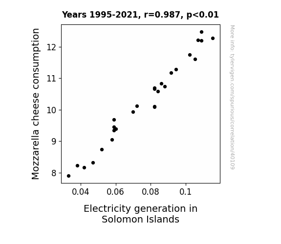 This means 97.4% of the change in the one variable (i.e., Electricity generation in Solomon Islands) is predictable based on the change in the other (i.e., Mozzarella cheese consumption) over the 27 years from 1995 through 2021.