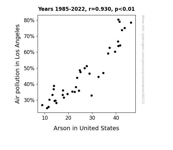 This means 86.4% of the change in the one variable (i.e., Arson in United States) is predictable based on the change in the other (i.e., Air pollution in Los Angeles) over the 38 years from 1985 through 2022.