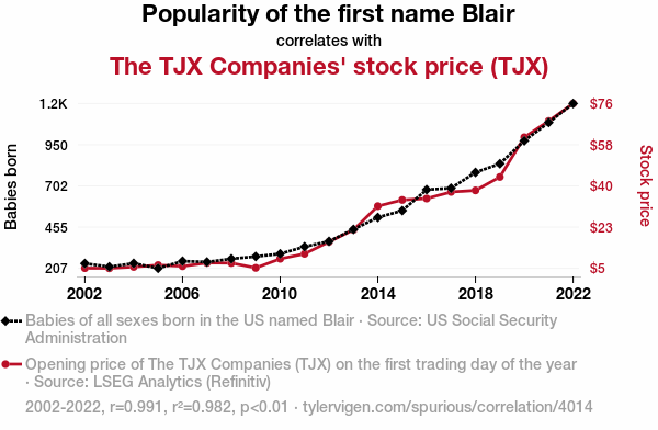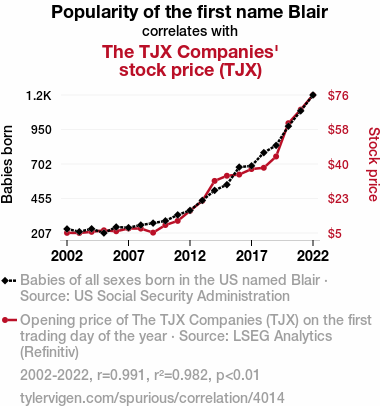 - The spurious research paper: The Blair Witch Stock Project: Examining the Blair Name Popularity and TJX Companies' Stock Performance