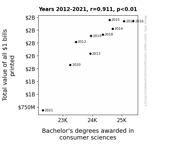This means 83% of the change in the one variable (i.e., Bachelor's degrees awarded in consumer sciences) is predictable based on the change in the other (i.e., Total value of all $1 bills printed) over the 10 years from 2012 through 2021.