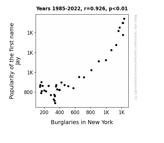This means 85.8% of the change in the one variable (i.e., Burglaries in New York) is predictable based on the change in the other (i.e., Popularity of the first name Jay) over the 38 years from 1985 through 2022.