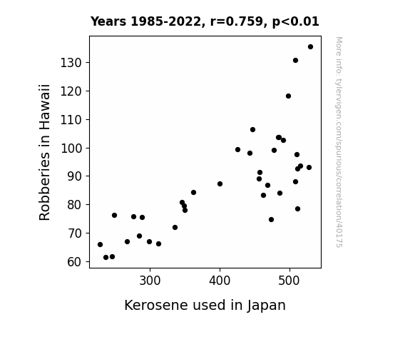This means 57.5% of the change in the one variable (i.e., Kerosene used in Japan) is predictable based on the change in the other (i.e., Robberies in Hawaii) over the 38 years from 1985 through 2022.