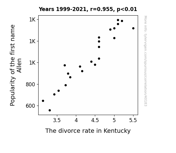 This means 91.1% of the change in the one variable (i.e., The divorce rate in Kentucky) is predictable based on the change in the other (i.e., Popularity of the first name Allen) over the 23 years from 1999 through 2021.