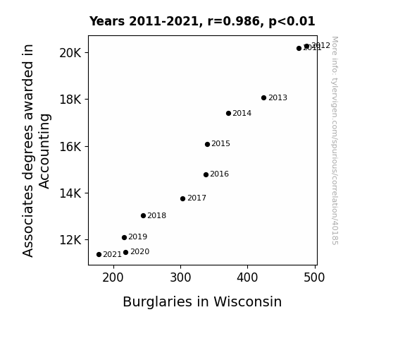 This means 97.3% of the change in the one variable (i.e., Burglaries in Wisconsin) is predictable based on the change in the other (i.e., Associates degrees awarded in Accounting) over the 11 years from 2011 through 2021.