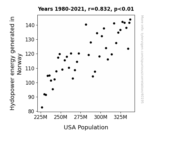 This means 69.3% of the change in the one variable (i.e., USA Population) is predictable based on the change in the other (i.e., Hydopower energy generated in Norway) over the 42 years from 1980 through 2021.