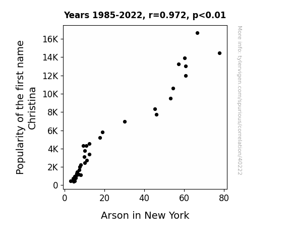 This means 94.6% of the change in the one variable (i.e., Arson in New York) is predictable based on the change in the other (i.e., Popularity of the first name Christina) over the 38 years from 1985 through 2022.