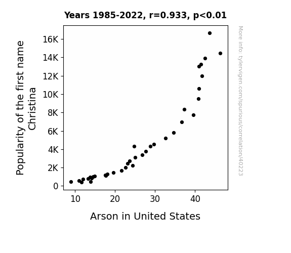 This means 87.1% of the change in the one variable (i.e., Arson in United States) is predictable based on the change in the other (i.e., Popularity of the first name Christina) over the 38 years from 1985 through 2022.