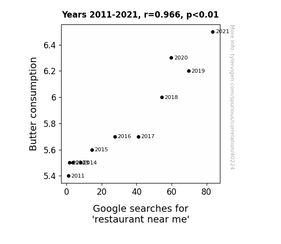 This means 93.4% of the change in the one variable (i.e., Google searches for 'restaurant near me') is predictable based on the change in the other (i.e., Butter consumption) over the 11 years from 2011 through 2021.