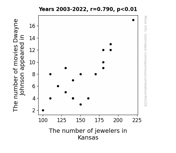 This means 62.4% of the change in the one variable (i.e., The number of jewelers in Kansas) is predictable based on the change in the other (i.e., The number of movies Dwayne Johnson appeared in) over the 20 years from 2003 through 2022.