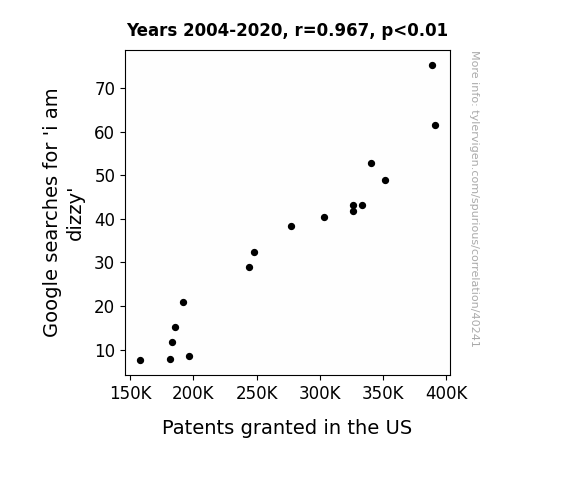 This means 93.5% of the change in the one variable (i.e., Patents granted in the US) is predictable based on the change in the other (i.e., Google searches for 'i am dizzy') over the 17 years from 2004 through 2020.