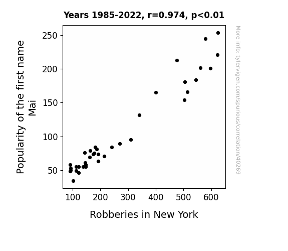 This means 94.8% of the change in the one variable (i.e., Robberies in New York) is predictable based on the change in the other (i.e., Popularity of the first name Mai) over the 38 years from 1985 through 2022.