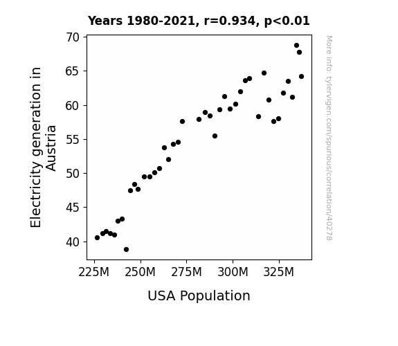 This means 87.2% of the change in the one variable (i.e., USA Population) is predictable based on the change in the other (i.e., Electricity generation in Austria) over the 42 years from 1980 through 2021.
