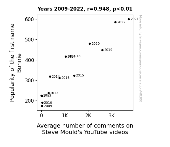 This means 89.9% of the change in the one variable (i.e., Average number of comments on Steve Mould's YouTube videos) is predictable based on the change in the other (i.e., Popularity of the first name Bonnie) over the 14 years from 2009 through 2022.
