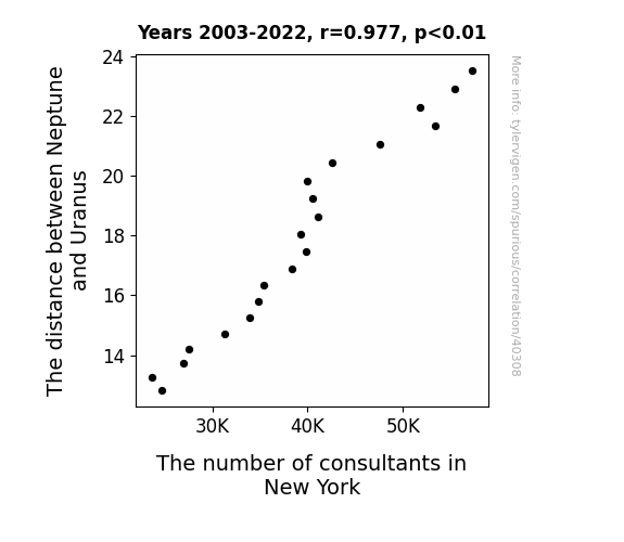 This means 95.4% of the change in the one variable (i.e., The number of consultants in New York) is predictable based on the change in the other (i.e., The distance between Neptune and Uranus) over the 20 years from 2003 through 2022.