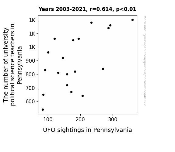 This means 37.7% of the change in the one variable (i.e., UFO sightings in Pennsylvania) is predictable based on the change in the other (i.e., The number of university political science teachers in Pennsylvania) over the 19 years from 2003 through 2021.