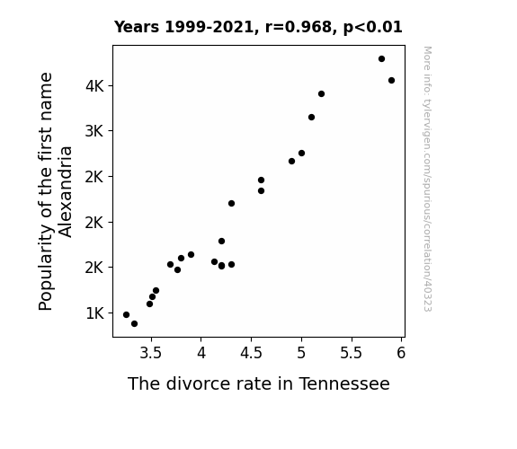 This means 93.6% of the change in the one variable (i.e., The divorce rate in Tennessee) is predictable based on the change in the other (i.e., Popularity of the first name Alexandria) over the 23 years from 1999 through 2021.
