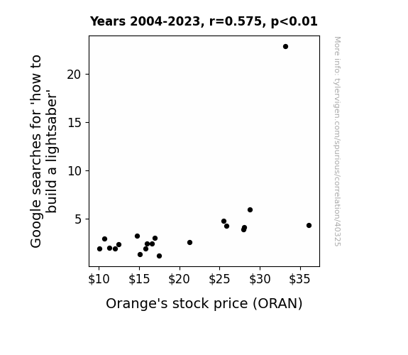 This means 33.1% of the change in the one variable (i.e., Orange's stock price (ORAN)) is predictable based on the change in the other (i.e., Google searches for 'how to build a lightsaber') over the 20 years from 2004 through 2023.