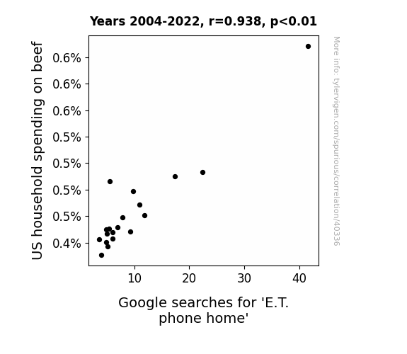 This means 88.1% of the change in the one variable (i.e., Google searches for 'E.T. phone home') is predictable based on the change in the other (i.e., US household spending on beef) over the 19 years from 2004 through 2022.