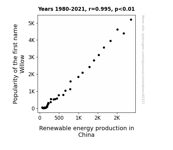This means 99.1% of the change in the one variable (i.e., Renewable energy production in China) is predictable based on the change in the other (i.e., Popularity of the first name Willow) over the 42 years from 1980 through 2021.