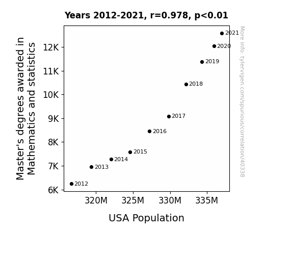 This means 95.6% of the change in the one variable (i.e., USA Population) is predictable based on the change in the other (i.e., Master's degrees awarded in Mathematics and statistics) over the 10 years from 2012 through 2021.