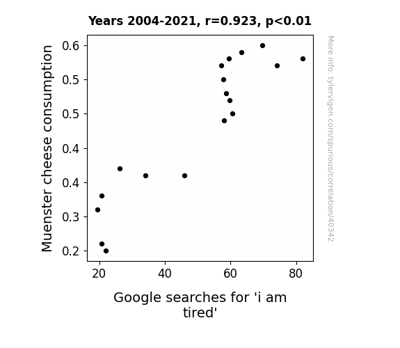 This means 85.1% of the change in the one variable (i.e., Google searches for 'i am tired') is predictable based on the change in the other (i.e., Muenster cheese consumption) over the 18 years from 2004 through 2021.