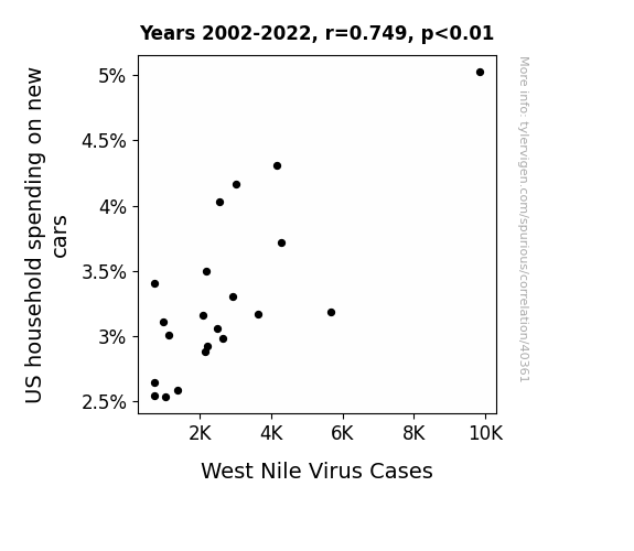 This means 56.1% of the change in the one variable (i.e., West Nile Virus Cases) is predictable based on the change in the other (i.e., US household spending on new cars) over the 21 years from 2002 through 2022.