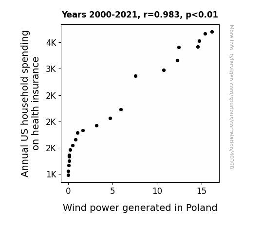 This means 96.5% of the change in the one variable (i.e., Wind power generated in Poland) is predictable based on the change in the other (i.e., Annual US household spending on health insurance) over the 22 years from 2000 through 2021.