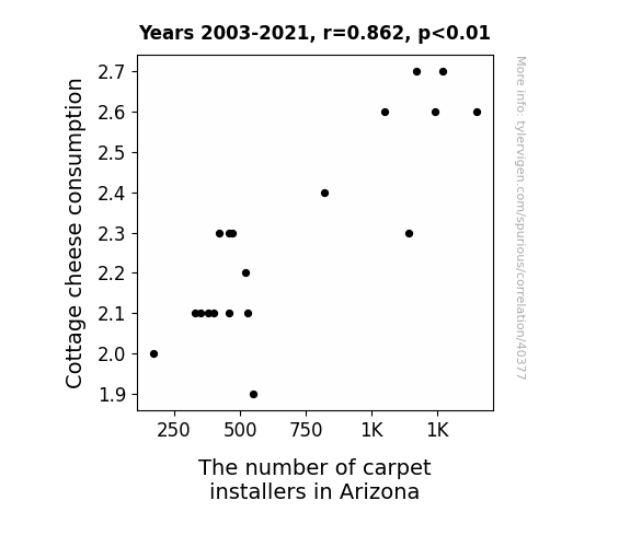 This means 74.4% of the change in the one variable (i.e., The number of carpet installers in Arizona) is predictable based on the change in the other (i.e., Cottage cheese consumption) over the 19 years from 2003 through 2021.