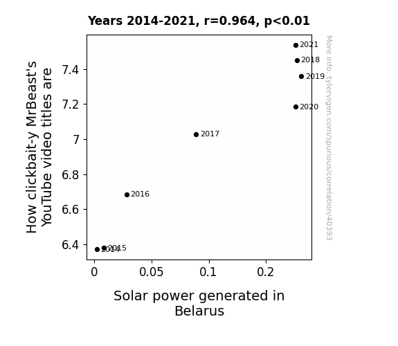 This means 93% of the change in the one variable (i.e., Solar power generated in Belarus) is predictable based on the change in the other (i.e., How clickbait-y MrBeast's YouTube video titles are) over the 8 years from 2014 through 2021.