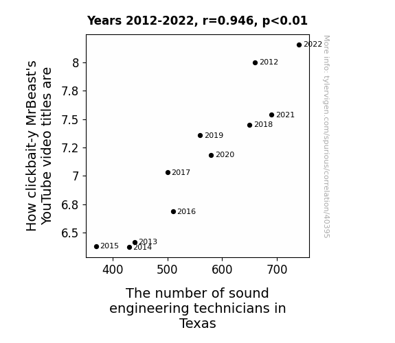 This means 89.6% of the change in the one variable (i.e., The number of sound engineering technicians in Texas) is predictable based on the change in the other (i.e., How clickbait-y MrBeast's YouTube video titles are) over the 11 years from 2012 through 2022.