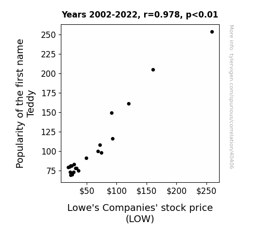 This means 95.6% of the change in the one variable (i.e., Lowe's Companies' stock price (LOW)) is predictable based on the change in the other (i.e., Popularity of the first name Teddy) over the 21 years from 2002 through 2022.