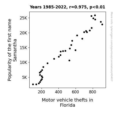 This means 95% of the change in the one variable (i.e., Motor vehicle thefts in Florida) is predictable based on the change in the other (i.e., Popularity of the first name Samantha) over the 38 years from 1985 through 2022.