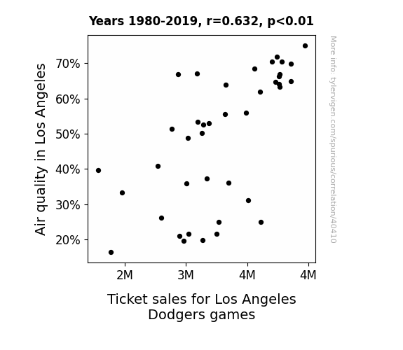 This means 40% of the change in the one variable (i.e., Ticket sales for Los Angeles Dodgers games) is predictable based on the change in the other (i.e., Air quality in Los Angeles) over the 40 years from 1980 through 2019.